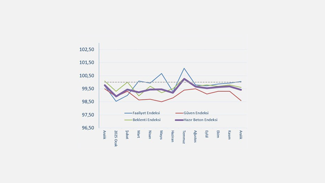 Türkiye Hazır Beton Birliği (THBB), inşaat sektörü ile bağlantılı imalat ve hizmet alanlarındaki mevcut durumu ve beklentileri ortaya koyan Hazır Beton Endeksi Aralık 2025 Raporu’nu yayımladı. Rapora göre, Hazır Beton Endeksi yılın son ayında 100 olarak kabul edilen kritik eşik seviyesine yaklaşmasına rağmen eşik değerin üzerine çıkamadı. Bu görünüm, inşaat sektöründe yıl sonunda faaliyetlerin korunduğunu ancak büyüme ivmesinin zayıf kaldığını ortaya koydu.